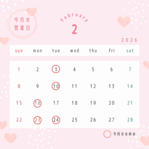 【おやすみ】 3日(火) 10日(火) 16日(月) 23日(月) 24日(火) よろしくお願いいたします。 2月は一番寒い時期ですが、暦の上では春です。 春を感じれる暖かい日が増えてきたり、花粉情報なんかも出てきました […]